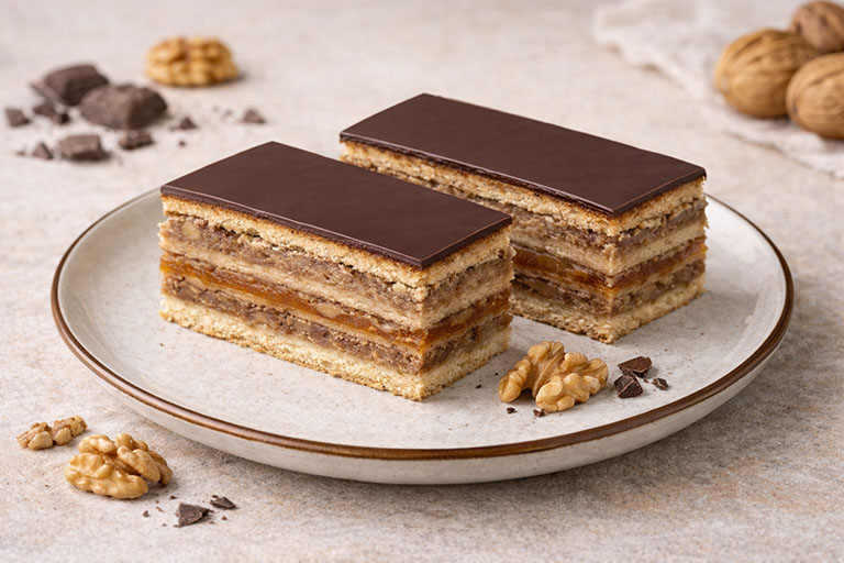 Három réteg omlós tészta, dús diótöltelék, baracklekvár és csokoládémáz – klasszikus, házias diós zserbó, frissen és tartósítószer nélkül.