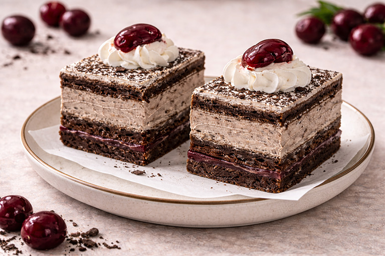 Klasszikus fekete-erdő ízvilág puha csokis piskótával, meggyes réteggel és krémes csokoládékrémmel. Gazdag, harmonikus desszert igazi csokirajongóknak.